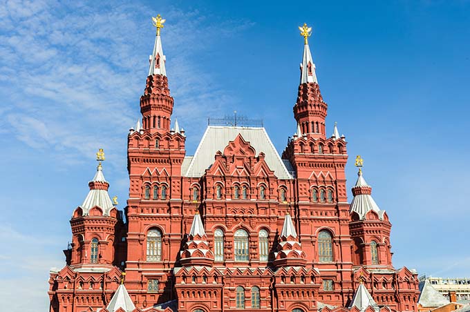 El Museo Estatal de Historia de Moscú es el espectacular edificio que está a la derecha cuando atraviesas la Puerta de la Resurrección para entrar en la Plaza Roja. Presentando la Historia Rusa desde el periodo Paleolítico hasta la actualidad, los objetos del museo se presentan con mucha información y son muy variados.